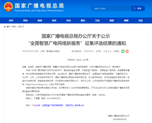 In order to further implement the spirit of General Secretary Xi Jinping‘s important instructions on ”promoting media integration and development, creating smart radio and television media, and developing smart radio and television networks“, and give full play to the demonstration and leading role of advanced models, in May 2022, the State Administration of Radio and Television launched the ”National Smart Radio and Television Network New Service“ collection and selection work.